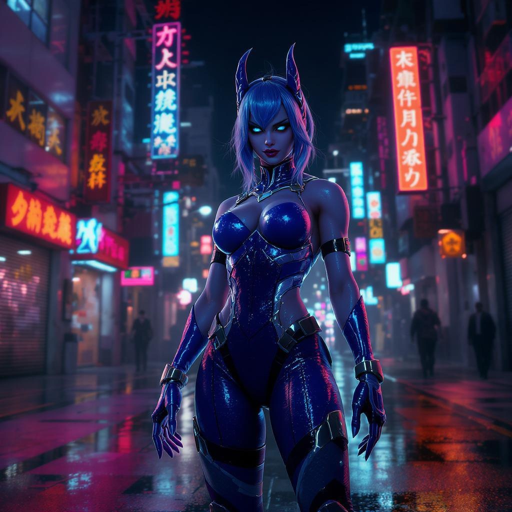 Kitana-inspired character, cyberpunk setting, nighttime urban street, royal blue accents, hyperrealistic detail, photorealistic rendering, 8K resolution, utilizing Unreal Engine, 3D visualization --aspect ratio 9:16, vibrant and expressive style, high detail intensity.