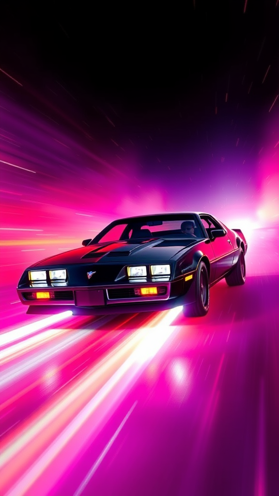 Kitt from Knight Rider::5 velocity of light, warp drive::3 vivid, neon, intense rainbow flow::2 glowing, detailed intricacy, cinematic brilliance::1