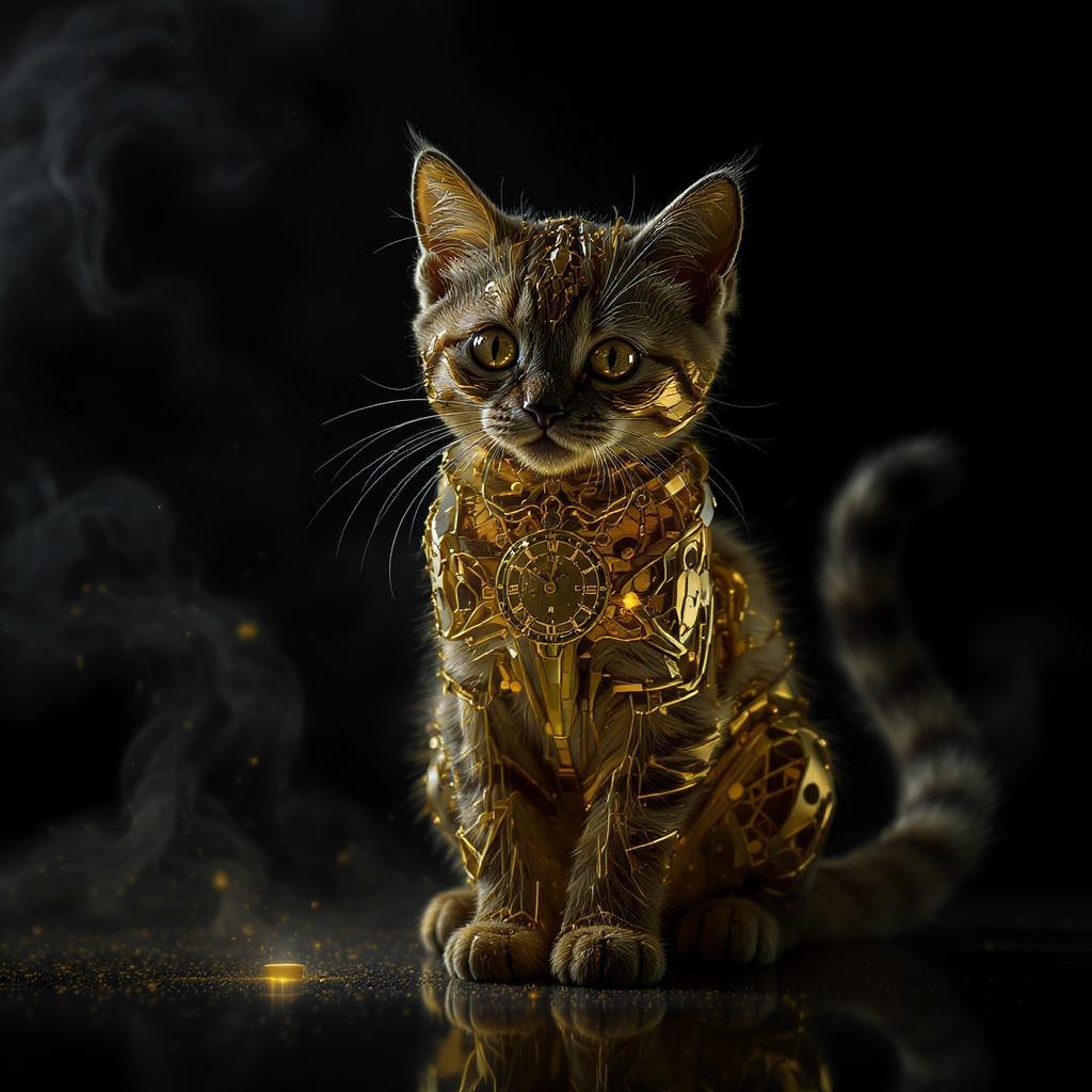 Kitten in shimmering gold clockwork design, intricate golden filigree set against an abstract shadowy backdrop, characterized by chiaroscuro lighting. The scene features high-detail photorealism and hyper-realistic elements, embodying a sense of dynamic motion and fluidity. Captured in super high-resolution 8K, the image evokes a cinematic feel with stunning long exposure effects, resulting in a visual masterpiece of precision and artistry.