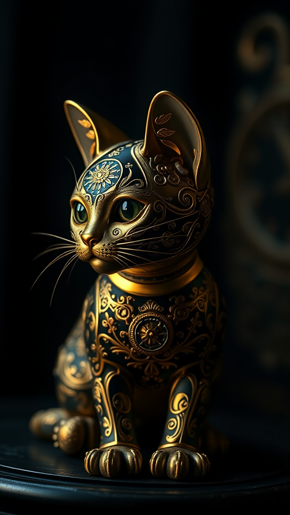 Kitten, intricately detailed gold clockwork feline with ornate filigree patterns set against a mysterious dark backdrop, showcasing intense chiaroscuro lighting, featuring high-detail photorealism and hyper-realistic textures. The scene embodies a sense of dynamic motion and clarity, captured with cinematic flair and long exposure for dramatic effect, rendered in ultra-high 8K resolution for vivid, super-resolution imagery.