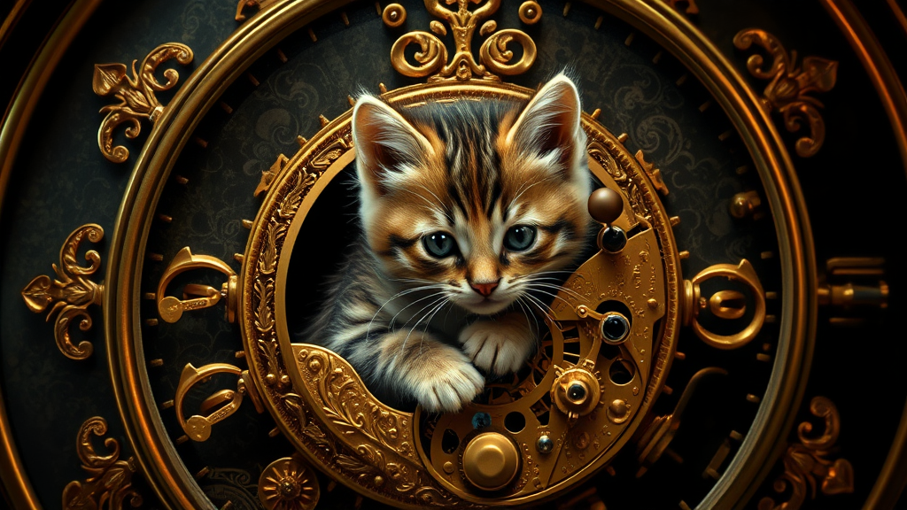 Kitten nestled within a mechanical gold clockwork cat adorned in intricate golden filigree, set against a rich, abstract dark background; the scene is bathed in chiaroscuro lighting to highlight the exquisite details. Emphasizing photorealism and hyper-realism, the image captures a sense of acceleration and motion through a cinematic style. The use of long exposure contributes to the depth and richness of the scene, rendered in stunning 8K HD super-resolution with a balanced 1:1 aspect ratio.