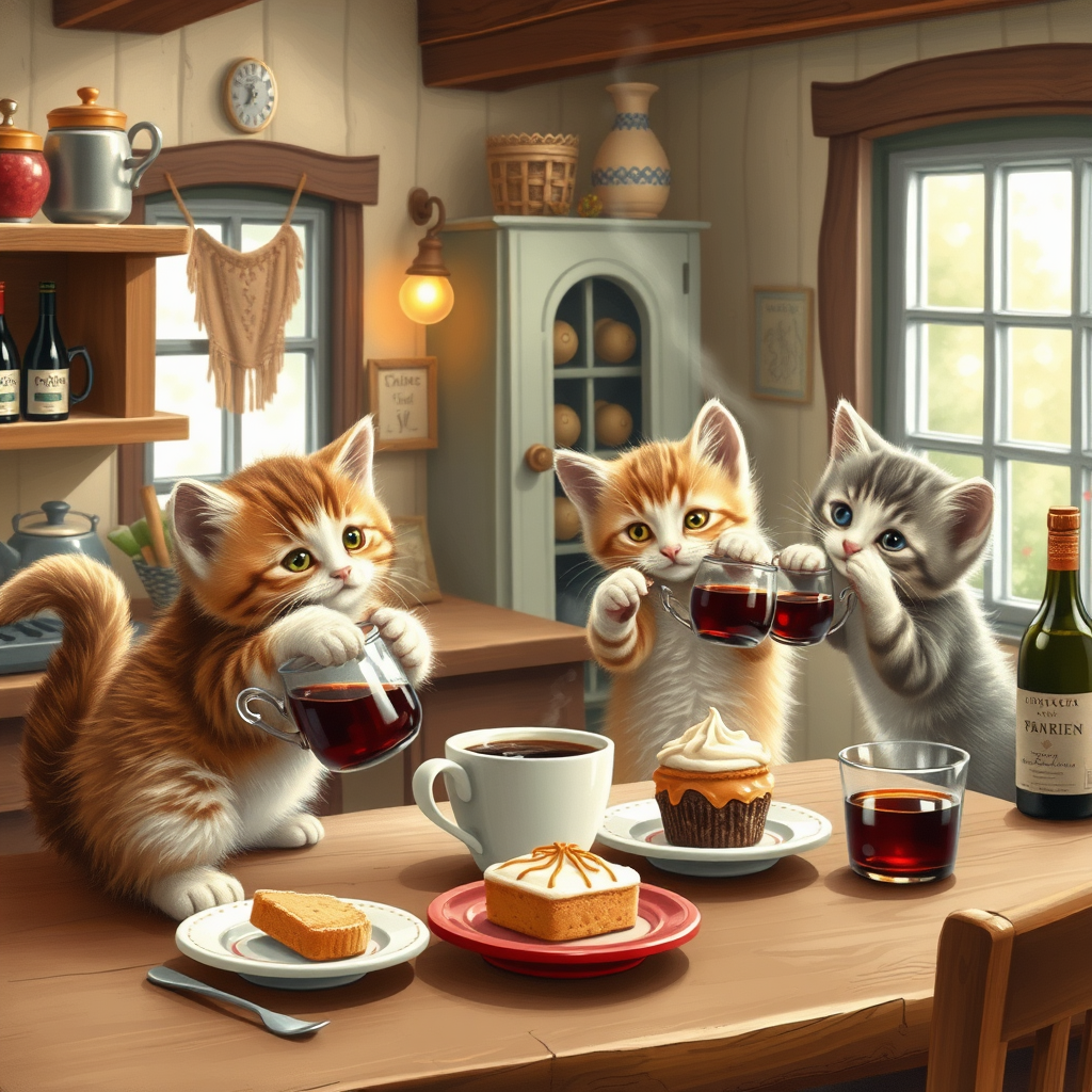 Kittens bustling about in a cozy cottage, brewing aromatic pots of tea, coffee, and rich hot chocolate, whisking tiny plates of treats from the kitchen, and carefully selecting fine wines from a quaint cellar, all while adding playful touches to their delightful culinary adventures.