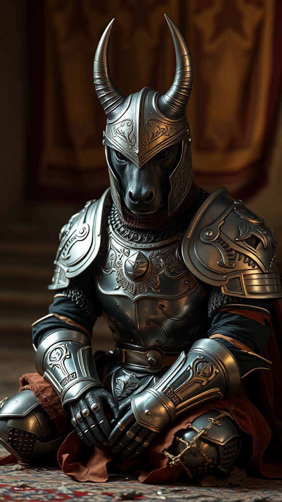 Kneeling pitbull knight in a portrait setting, adorned in finely detailed armor with intricate designs, a blend of silver and silk materials, captured with cinematic lighting in high definition, showcasing a noble and fierce expression, set against a vertical 9:16 aspect ratio.