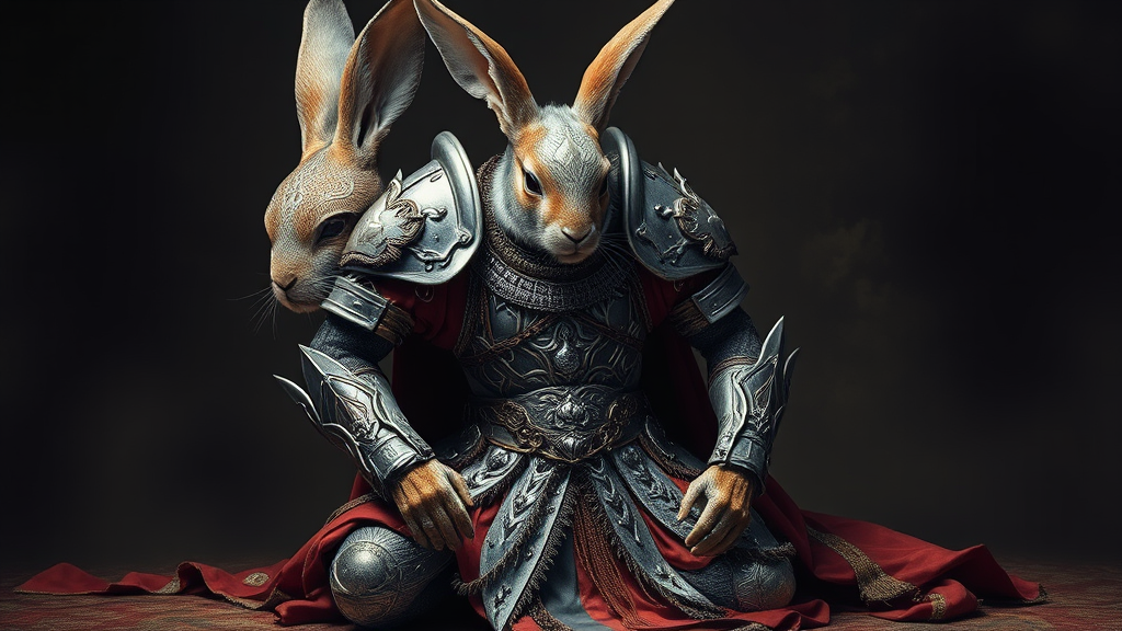 Kneeling rabbit warrior portrait, exquisitely detailed armor, elaborate design, polished silver, woven silk, dramatic lighting, high resolution.