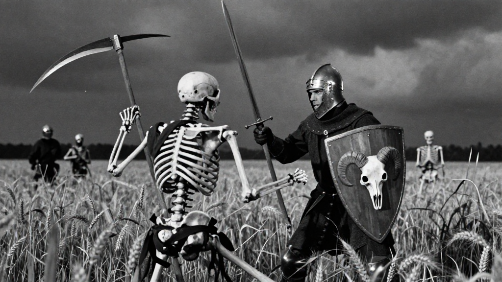 A medieval knight, armed with a sword and a ram skull shield, confronts a skeleton warrior wielding a scythe in a dramatic black and white scene. The intense battle unfolds in a field of tall wheat under a cloudy night sky, evoking a classic horror film aesthetic.