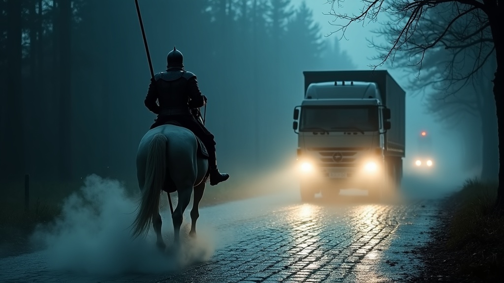 A lone knight on a white horse, lance poised, faces an oncoming truck on a misty, cobblestone road at night. Headlights cut through the fog, illuminating the wet ground and creating a dramatic, surreal atmosphere.