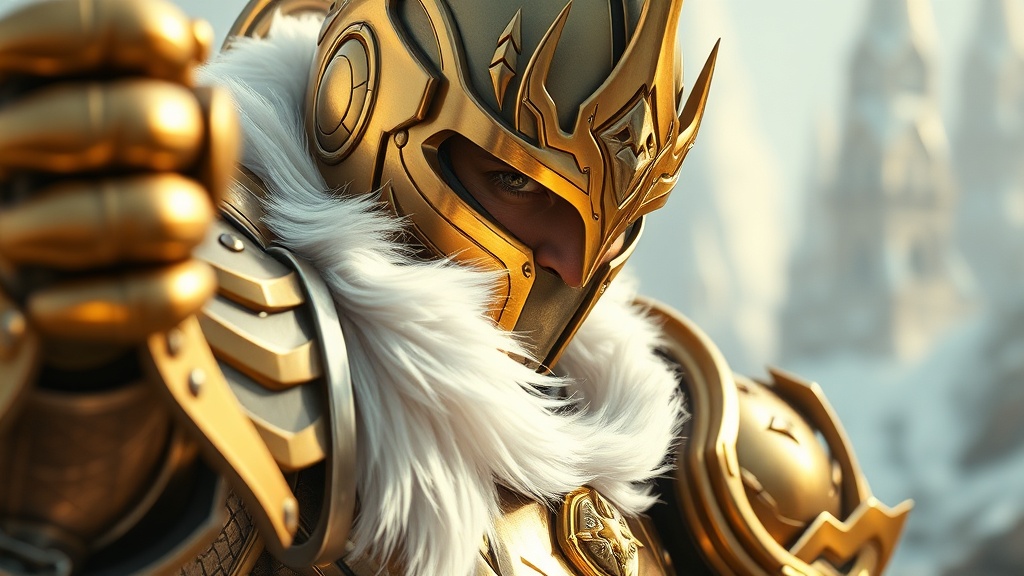 A noble knight of the highest order, dynamically poised in the midst of a grand battle, depicted in the ultra-realistic rendering style of Unreal Engine. Their armor gleams with an opulent dark gold intertwined with pristine white, exuding a regal aura. The close-up shot showcases the intense focus in the knight's eyes, while metallic finishes catch glints of ethereal light. The scene is set in a mesmerizing aurorapunk world, where cinematic vistas provide a breathtaking backdrop. Drawing inspiration from the furaffinity aesthetic, the environment melds organic elements with advanced technology, enhancing the knight's bold presence. The aspect ratio of 71:63 adds a unique visual flair to the composition.