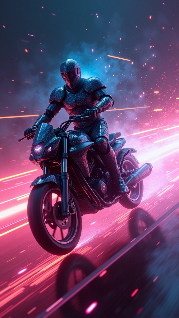 View this AI-generated image featuring knight rider velocity of photons hyperspace 5 vivid neon intense rainbow trails 4 glowing intricate textures dramatic lighting 1. Created using advanced AI technology, this image showcases creative visuals, AI artwork. Perfect for creative projects, digital art
