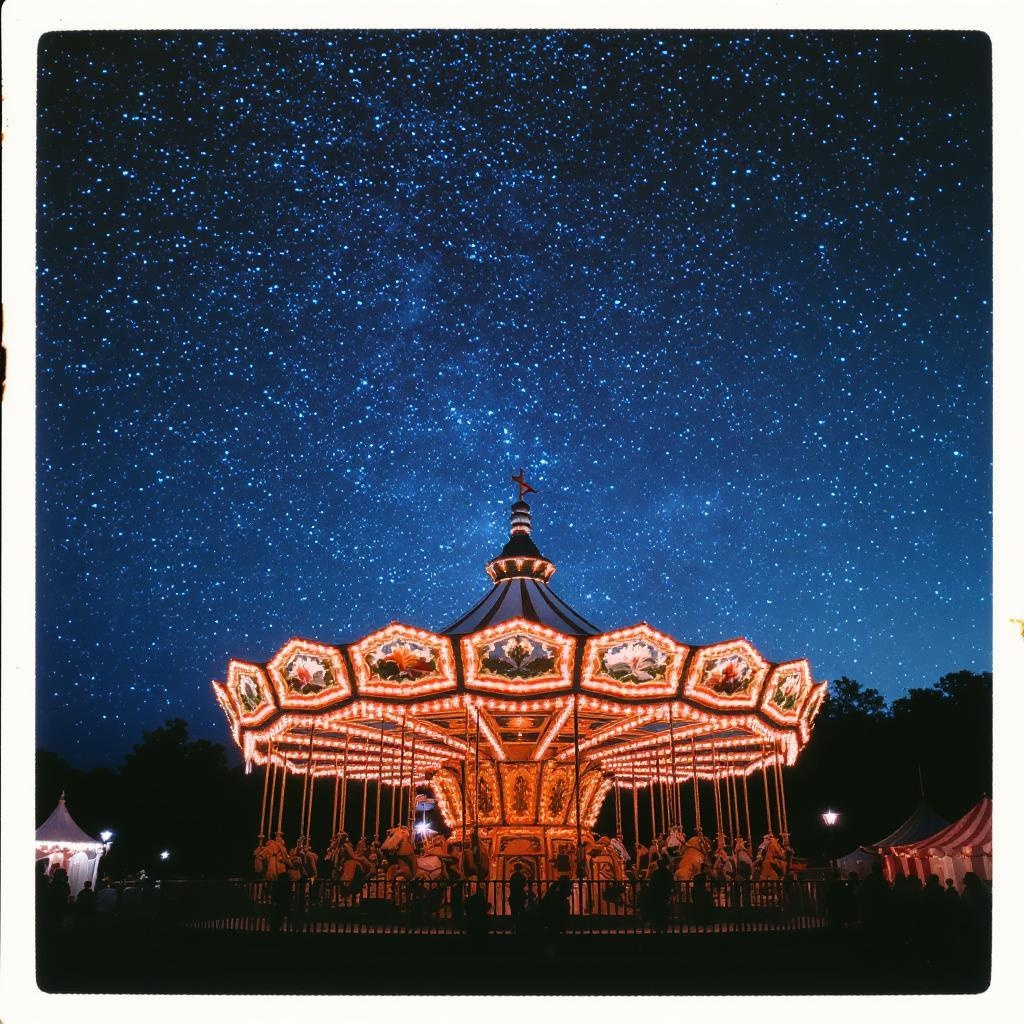 Kodak-inspired photograph of a carousel under starry night, ethereal ambience, instagram aesthetic, ultra-high resolution, minimalist composition, contemporary style, aspect ratio 4:3.