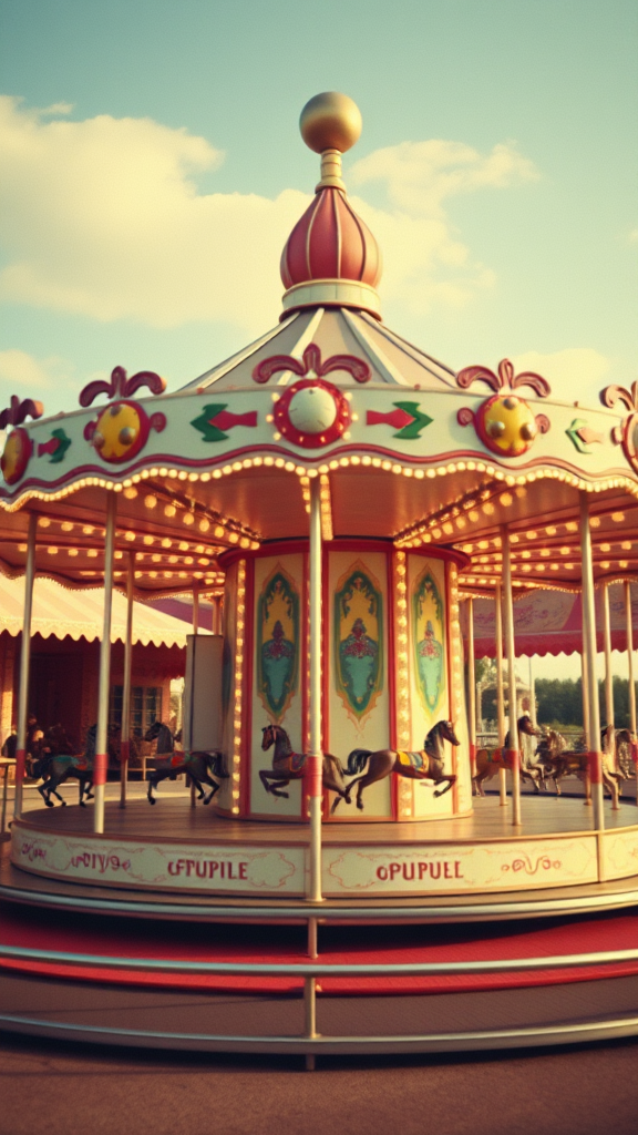 Kodak photography capturing a whimsical merry-go-round scene, evoking a dreamy and nostalgic mood with a touch of Instagram aesthetic, rendered in 8k resolution. Emphasizing minimalism and modern design, the image portrays a serene yet vibrant atmosphere with a 4:3 aspect ratio.