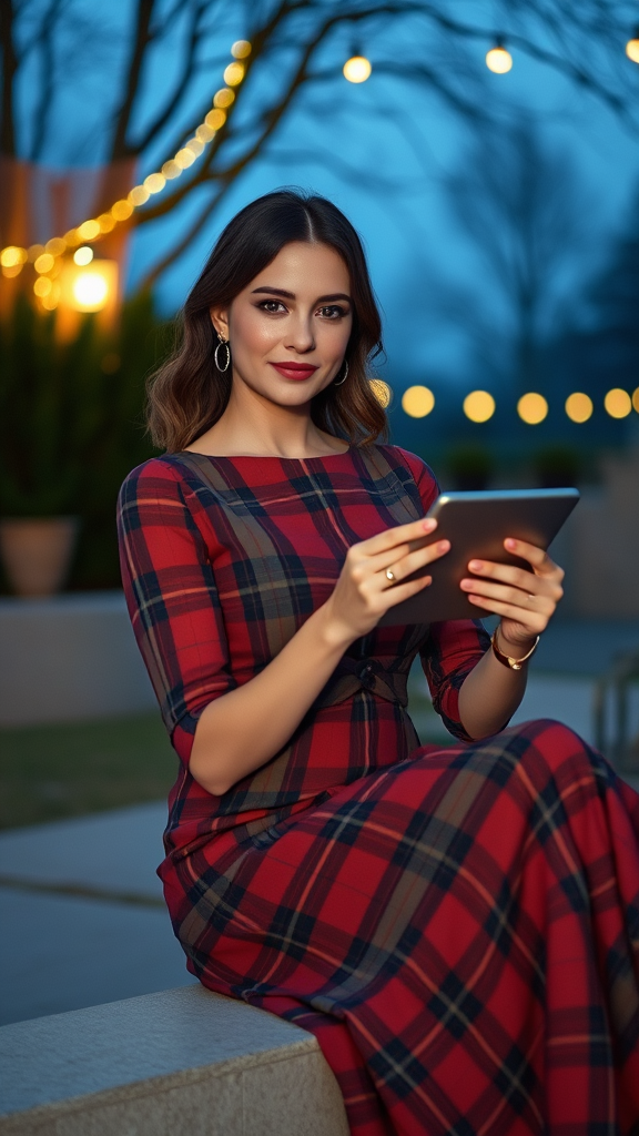 Kodak Portra 400, 8k, a beautiful woman seated gracefully holding a tablet, dressed in a sophisticated tartan dress, outdoor setting, evening ambiance, soft ambient lighting, realistic portrayal, highly detailed, artful photography, subtle contrast ratio, aspect ratio 9:16, degree of stylization 750.