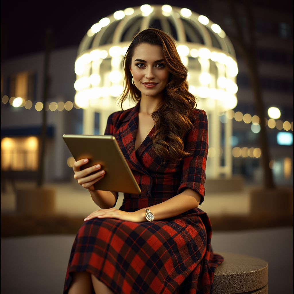 Kodak Portra 400, 8k, a beautiful woman seated gracefully holding a tablet dressed in a sophisticated tartan dress, outside, nighttime setting, soft diffused lighting, lifelike, intricately detailed, low contrast photography, with a warm glow illuminating her surroundings in a serene ambiance --ar 9:16 --s 750.