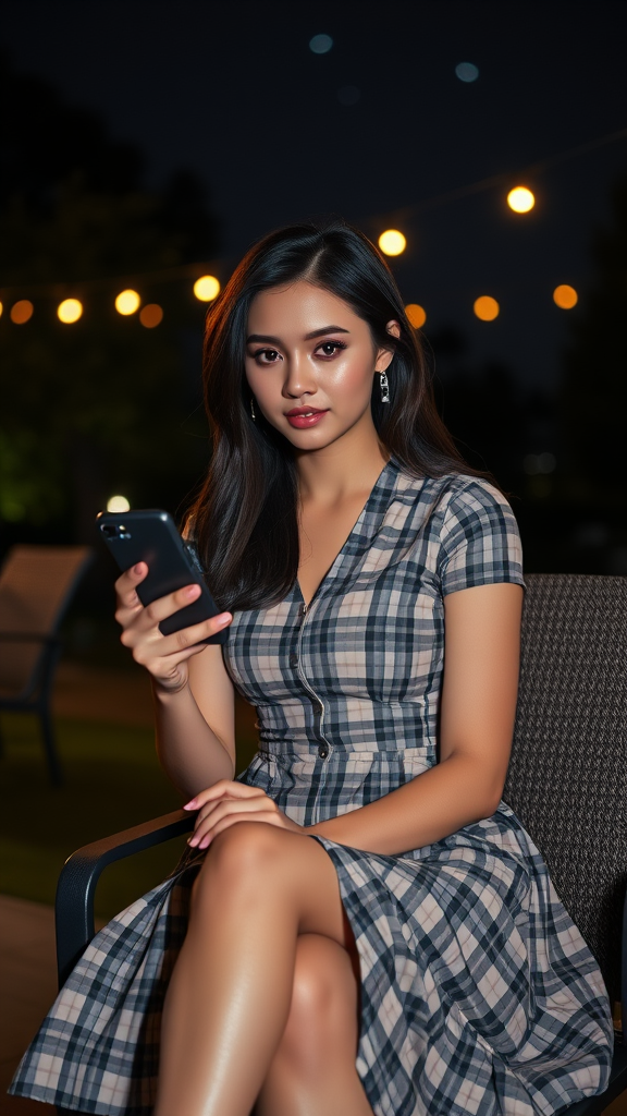 Kodak Portra 400, 8k, a beautiful woman seated while holding a smartphone, dressed in a sophisticated checkered dress, outdoor setting, under the stars, atmospheric lighting, realistic, intricately detailed, cinematic photography, soft contrast --ar 9:16 --s 750