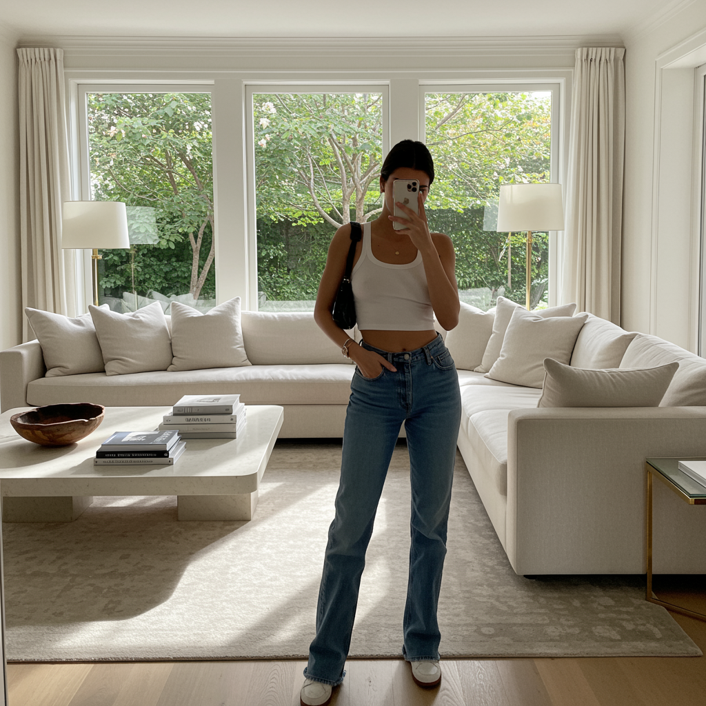 Koh_KendallJenner white tank top and jeans standing in a chic living room taking a selfie with natural light streaming through the windows softening the ambiance best quality calm vibe elegant modern decor