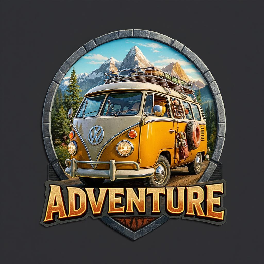 Kombi van adventure logo icon, 3D design with high detail, realistic and vibrant RAW colors, featuring a detailed landscape backdrop in 8k resolution, encapsulating the essence of exploration and wanderlust with artistic flair and imaginative adjustments.