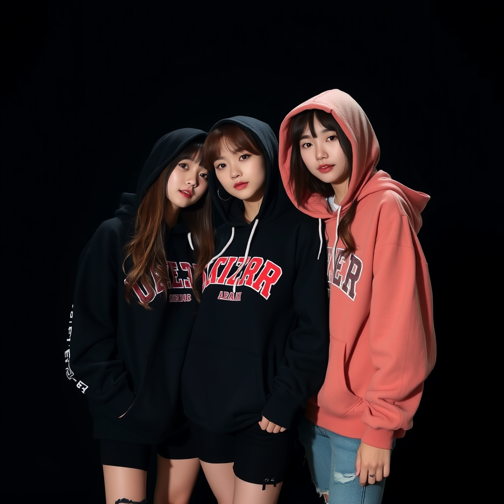 Korean girls in trendy hoodies against a dark backdrop, showcasing stylish urban fashion with a touch of modern chic.