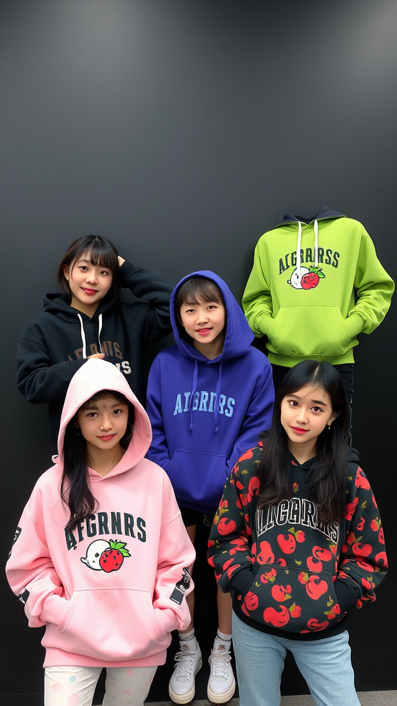 Korean girls modeling trendy hoodies against a sleek black backdrop, showcasing a mix of modern streetwear styles and vibrant colors with playful patterns.