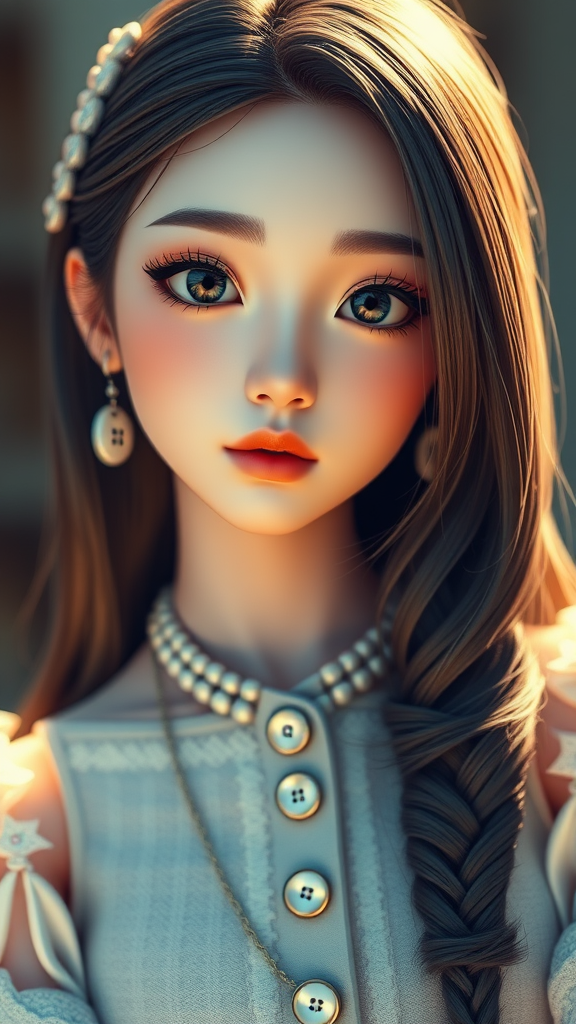 Korean pop idol girl, stunningly beautiful with symmetrical eyes, adorned in photorealistic jewelry, featuring intricate buttons, captured in a CGI 3D render, resembling a lifelike doll with a touch of cartoon and anime aesthetics, presented in a digital illustration and painting style, retaining a textural charm with subtle jpeg artifacts.