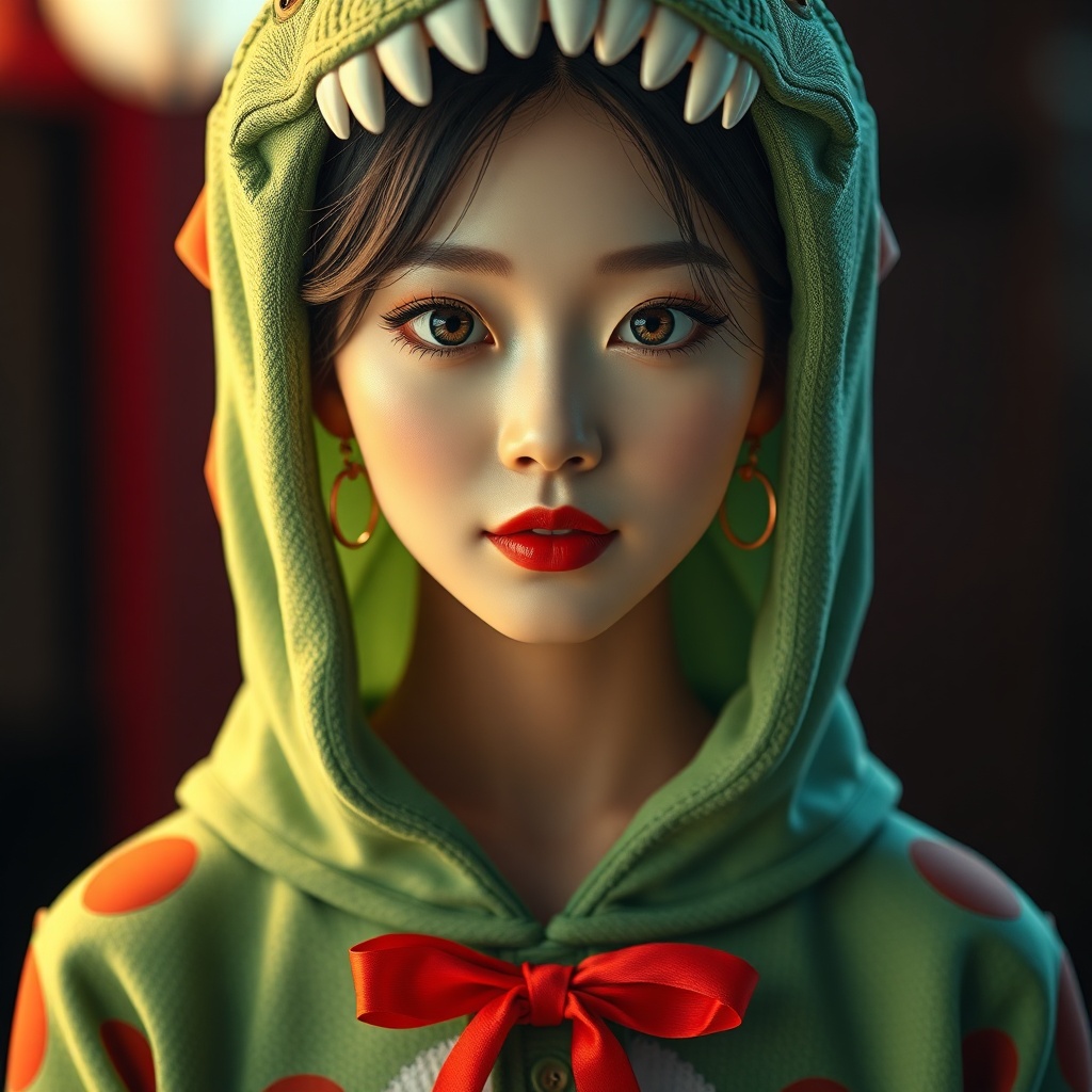 A stunning Korean woman resembling a K-pop idol, dressed in a playful dinosaur costume, with perfectly symmetrical eyes, ultra high-resolution, photorealistic, 8k hyperrealism. Captured in dramatic lighting, the image has a photographic quality, showcasing her soft red lipstick and exquisite jewelry. The visual blends CGI, 3D elements, and a doll-like charm, rendered in octane with a mix of cartoon and anime influences. This digital art piece, a vibrant illustration, has subtle text elements and is slightly cropped, with intentional jpeg artifacts. The costume includes playful ties and buttons, with hints of low-res red elements contrasting the high detail.