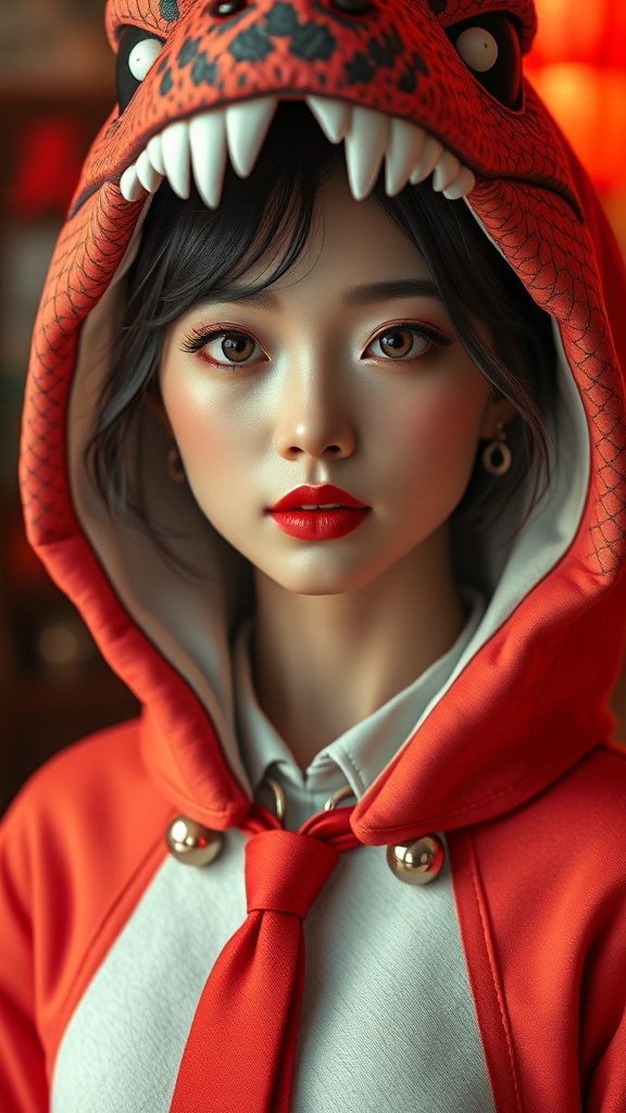 A stunning Korean woman resembling a K-pop idol is dressed in a whimsical dinosaur costume. Her symmetrical eyes are striking in this ultra high-resolution, photorealistic depiction, showcasing hyperrealism with dramatic lighting akin to professional photography. She wears soft red lipstick and elegant jewelry, enhancing her captivating appearance. The image blends CGI and 3D elements, offering a doll-like quality with Octane rendering. It merges cartoon and anime styles with detailed illustration and digital painting techniques. The digital art displays subtle textural depth, while clever cropping adds intrigue. Despite the high resolution, there are trace hints of JPEG artifacts, and the woman accessorizes with a tie and buttons in a tasteful nod to low-res aesthetics. Red hues punctuate the scene, infusing it with warmth and vibrancy.