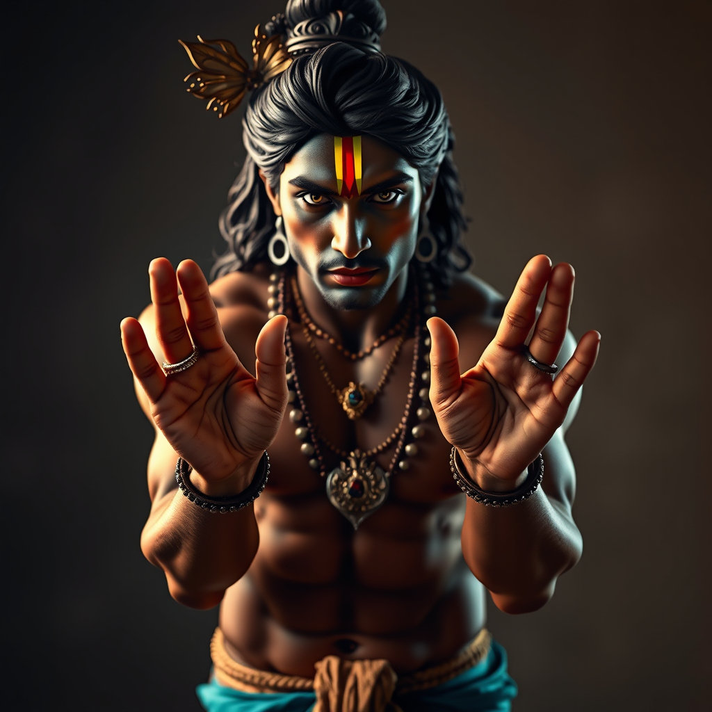 Krishna, captured in Ultra-Wide Angle – Camera pulled far back, ultra-realistic depiction of an Indian male, muscular and poised, with flawless hands, striking eyes, and an impeccable face. Featuring two arms and five fingers on each hand, enhanced with brilliant colors and sharp focus. His physique and legs are elegantly displayed, evoking an orientalist aesthetic with intricate detail. Inspired by the works of William Blake Richmond and John William Waterhouse, the scene is cinematic and embodies hyper realism. The dramatic lighting heightens the photo-realistic quality, emphasizing high detail in HD 8K resolution.