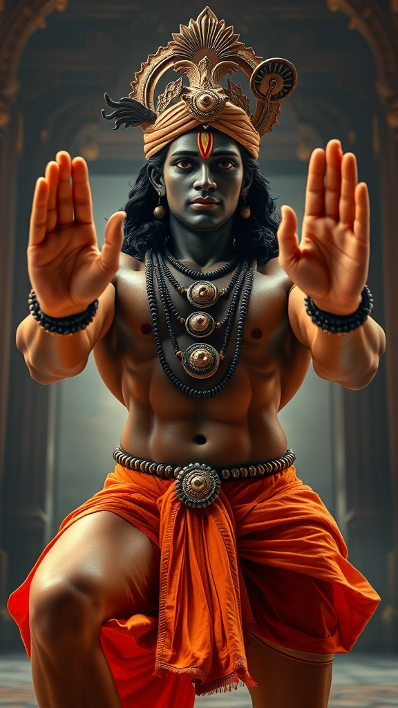 Krishna, captured with an ultra-wide angle lens, the camera pulling back to reveal a majestic scene, featuring an ultra-realistic, muscular Indian male figure. His form is striking and immaculate, with perfectly sculpted features including hands, eyes, and a flawless countenance. His two strong arms are highlighted, complete with five finely-detailed fingers on each perfect hand. The scene is sharpened, bursting with brilliant colors, and his legs are prominently showcased. The composition blends the allure of Orientalist art with intricate detailing reminiscent of the works of William Blake Richmond and John William Waterhouse. The setting is cinematic, infused with hyper-realism, and utilizes dramatic lighting to enhance its photo-realistic and high definition qualities, rendered in stunning 8K.