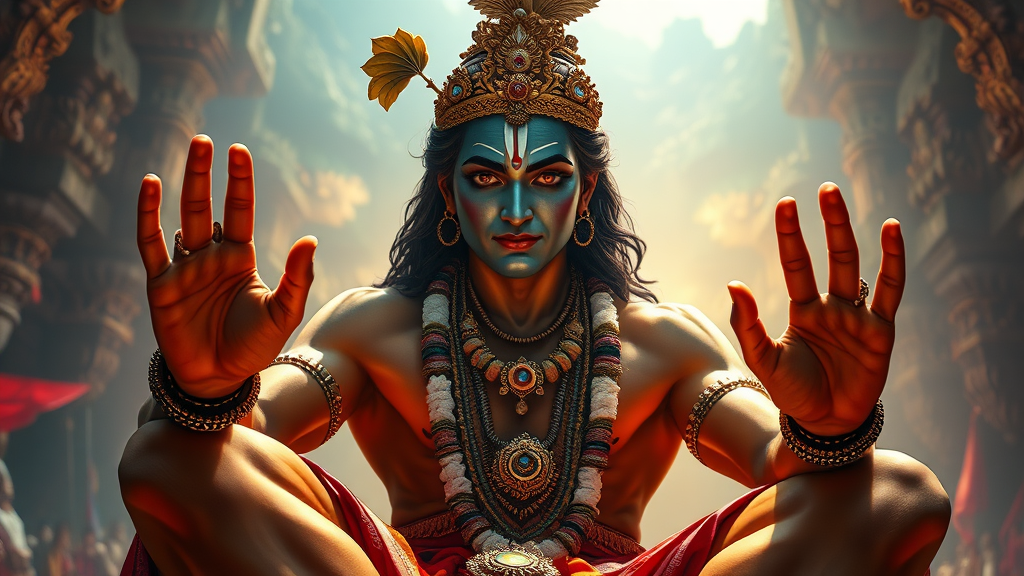 Krishna, captured with dazzling ultra-wide perspective, seated in an expansive setting that magnifies his commanding presence; ultra-realistic depiction of a muscular, Indian male, his eyes possessing an entrancing depth, his face sculpted to perfection. His hands appear divine, with each of his ten fingers finely detailed and expressive, conveying a blend of strength and grace. The scene bursts with brilliant colors, each hue enhancing the majestic aura that surrounds him. His posture reveals powerful legs, adding balance and symmetry to the composition. The artistic inspiration draws from the orientalism of William Blake Richmond and John William Waterhouse, blending their influences into a rich tapestry of cinematic hyper-realism. The lighting casts dramatic shadows, intensifying the photo-realistic effect; every pore, every sinew rendered in high-detail, HD, 8K fidelity.