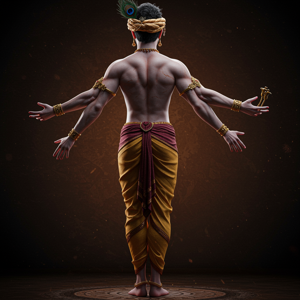 Krishna, ultra-wide angle composition, camera pulled back, hyper-realistic male with a finely sculpted physique, Indian heritage, flawless hands, striking eyes, impeccably symmetrical face, two strong arms, five fingers on each hand, meticulous detailing, enhanced sharpness, vivid and brilliant colors, full view including legs, inspired by Orientalist art, intricate detailing akin to the work of William Blake Richmond and John William Waterhouse, cinematic style, dramatic and dynamic lighting, photo-realistic with the highest level of detail, 8K high-definition quality.