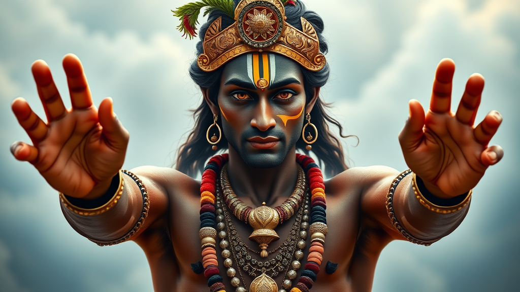 Krishna, Ultra-Wide Perspective - Capture the scene from a great distance, ultra-realistic depiction of an Indian male with a muscular build, featuring flawless hands and eyes, symmetrical face, two arms, five fingers each, emphasize the perfection in details, sharpened features, vibrant colors, full view including legs, rich orientalist influences, with intricate detailing, inspired by the works of William Blake Richmond and John William Waterhouse, cinematic flair, hyper-realism, dramatic lighting, photo-realistic quality, exceptional high detail, HD, 8K resolution.
