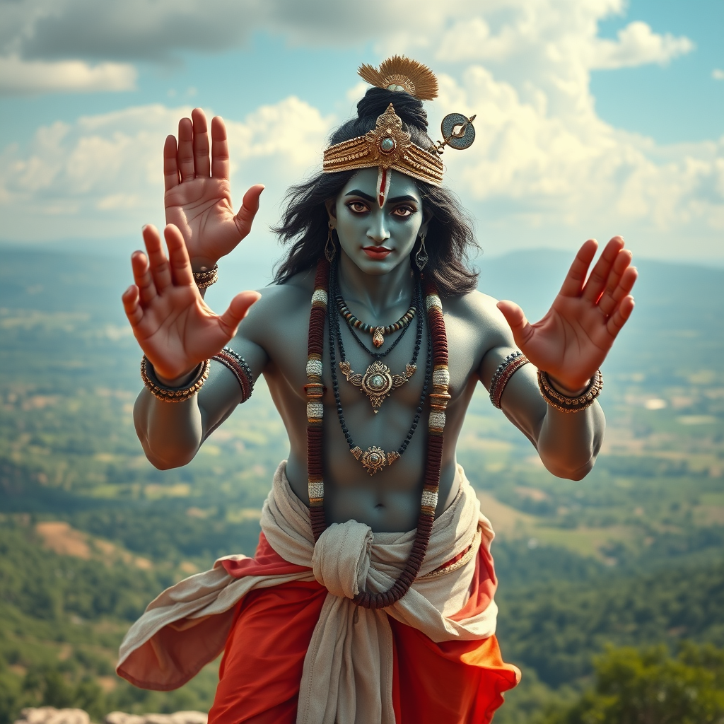 Krishna, vast landscape view, ultra-wide perspective capturing subject from a distance, exceptionally realistic, male, robust build, Indian heritage, flawless hands, captivating eyes, impeccable features, two arms, five fingers, polished appearance, enhanced sharpness, vibrant hues, full view including legs, with an orientalist touch, intricate detailing, inspired by William Blake Richmond and John William Waterhouse, cinematic grandeur, hyper-realism, dramatic lighting effects, photorealistic rendering, meticulously detailed, HD, 8K resolution.