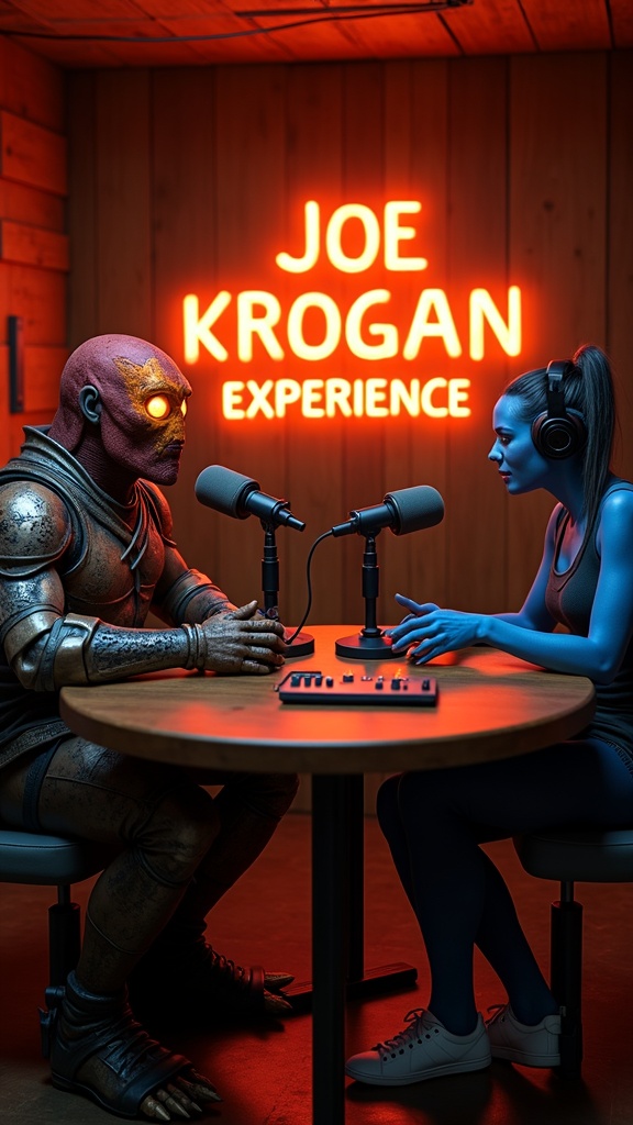 A photorealistic image of a Krogan and an Asari sitting at a round wooden table, facing each other, on a podcast set. The Krogan is on the left, wearing detailed, weathered silver and bronze armor, with a red and orange head and glowing red eyes. The Asari is on the right, with blue skin, dark headphones, and is gesturing with her hands. Both have microphones in front of them. Behind them is a wooden wall with a bright orange neon sign that reads "THE JOE KROGAN EXPERIENCE". The room has acoustic foam panels on the walls and ceiling. The lighting is warm and dim, creating a cozy and intimate mood. The colors are predominantly earthy tones of brown and grey, with pops of orange from the neon sign and blue from the Asari. Detailed podcast equipment is on the table, including headphones and a mixing board. Full body shot showing the Krogan's clawed feet and the Asari's white sneakers.