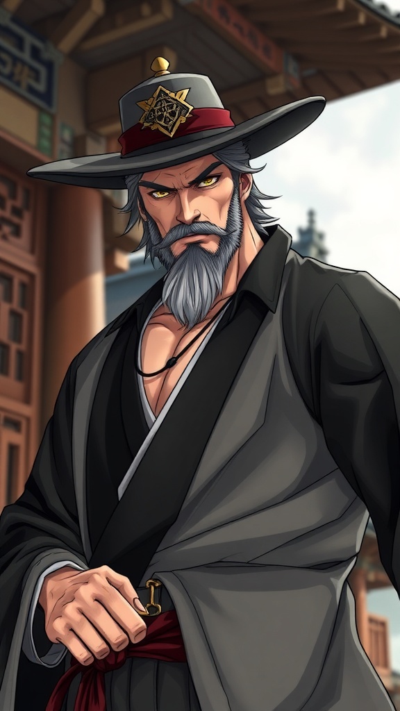 Kyoraku Shunsui, solo male, mature bara, cowboy shot, muscular figure, set against detailed East Asian architecture, featuring depth of field, wearing a hat, rendered in best quality, masterpiece, ultra high resolution, with an intricate background. Incorporating small creative twists while retaining the essence, avoiding elements like low resolution, poor quality, jpeg artifacts, and distorted features such as poorly drawn hands or face, deformed or blurry aspects. Ensure proportionate anatomy without extra limbs or mutated features, maintaining clarity and elegance in design.