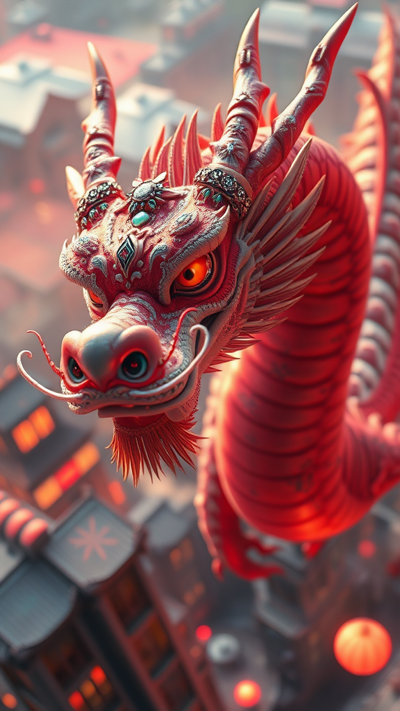 Kyoto Animation-inspired anime blended with traditional Chinese art, featuring a dragon soaring through a modern cyberpunk fantasy world. The scene showcases cinematic and ethereal lighting, with intricate and richly colored details. The composition is a breathtaking masterpiece, captured from an aerial view, utilizing HDR and UHD quality as if created with Unreal Engine. The dragon presents a captivating look towards the camera, with flawlessly smooth features and a dark fantasy backdrop, adorned with glittering jewelry. It has fair skin, an exquisite face, and a rich array of details, producing a high-quality, glamorous effect. The lighting and shadows are gorgeously detailed, emphasizing every decoration and line within the scene, creating an 8k, extraordinarily detailed and hypermaximalist visual experience.