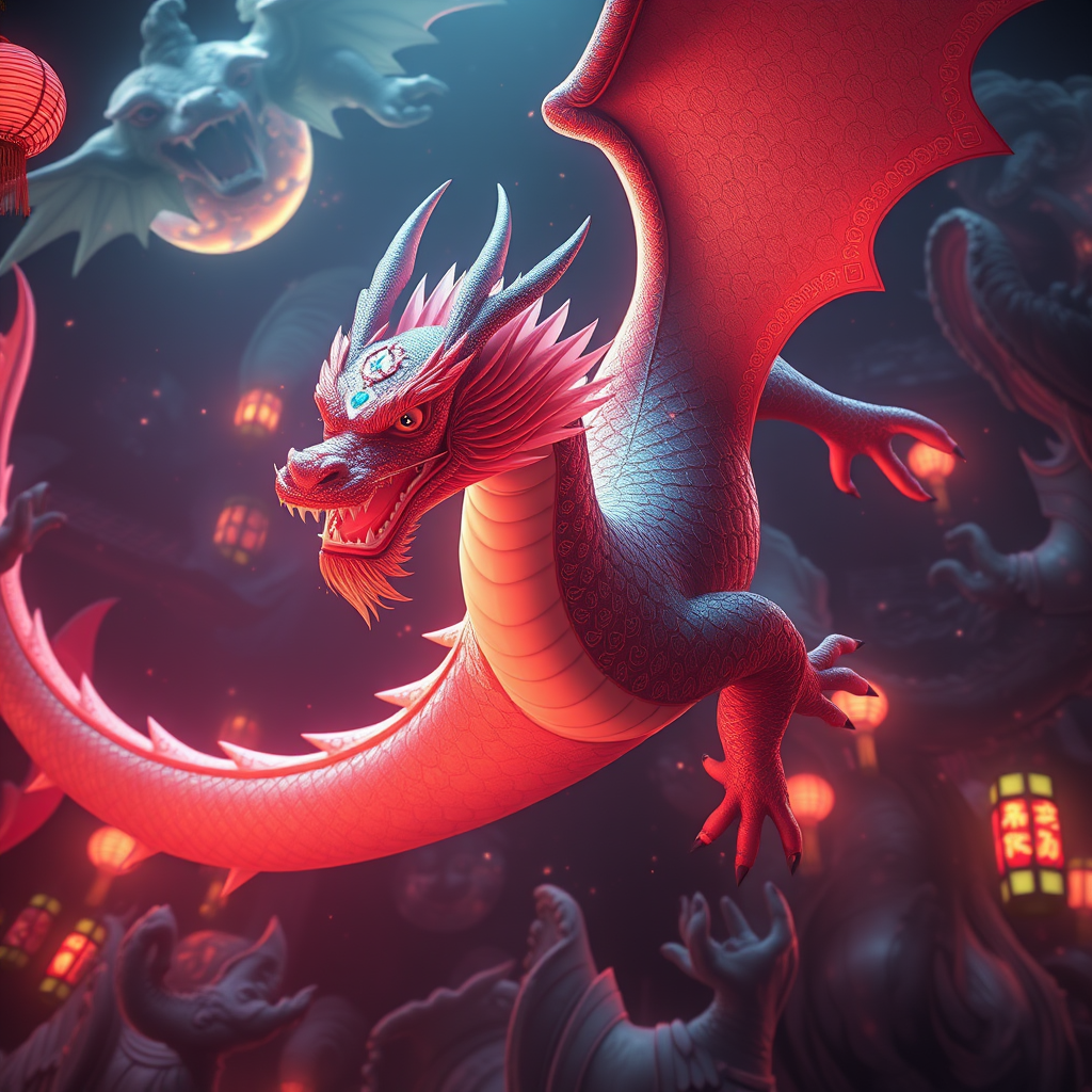 Kyoto Animation-inspired anime meets traditional Chinese artwork in a stunning fusion, depicting a dragon soaring through a modern cyberpunk fantasy world. The scene is illuminated with cinematic lighting, ethereal glows, and intricate details of incredible intricacy, showcasing rich, vibrant colors. Captured from an aerial view in HDR UHD, the setting feels as if rendered in an unreal engine, emphasizing smooth features, including thighs, in a dark fantasy backdrop adorned with glittery jewelry. A representative figure with fair skin and a beautiful, captivating face stands out, encompassed by gorgeous light and shadow. The scene is replete with detailed decorations and intricate lines, producing a high-quality, glamorous, 8k masterpiece with superlative detail, devoid of any imperfections or distractions such as low quality, text logos, watermarks, or anatomical errors.