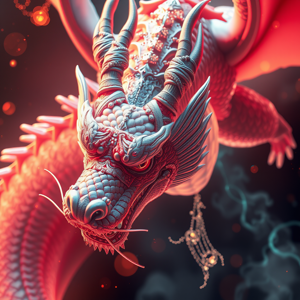 Kyoto Animation stylized anime blended with traditional Chinese art inspires a captivating scene of a dragon soaring through a futuristic cyberpunk fantasy world. The atmosphere is illuminated with cinematic, ethereal lighting, revealing intricate and hyper-detailed features that display incredible craftsmanship. The composition bursts with rich, vibrant colors and a hypermaximalist approach, capturing a true masterpiece in high-quality 8k resolution. From an aerial view, the dynamic lighting plays beautifully across the dragon's scales, reflecting an interplay of gorgeous light and shadow. The background is a dark fantasy realm embellished with glittering jewelry elements. The dragon's visage exudes beauty and confidence, with fair skin and a face rich in detail and glamor. Every aspect is designed with meticulous attention to detail, ensuring a stunning visual with smooth, flowing lines. The scene embodies an unreal engine's cinematic quality, offering viewers an enchanting glimpse into a world of fantasy that is rich and immersive without blemish or distraction.