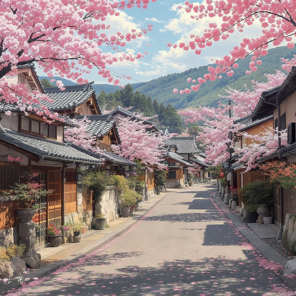 Kyoto landscape, immersive walking tour of Japan featuring tranquil village scenes, infused with Hinchel's unique style, capturing the essence of villagecore aesthetics, rich in manga influence with a spiritual resonance, high quality and multi-layered artistry reminiscent of John Salminen's work, set in a 17:32 aspect ratio, with a stylized approach adding depth and character.
