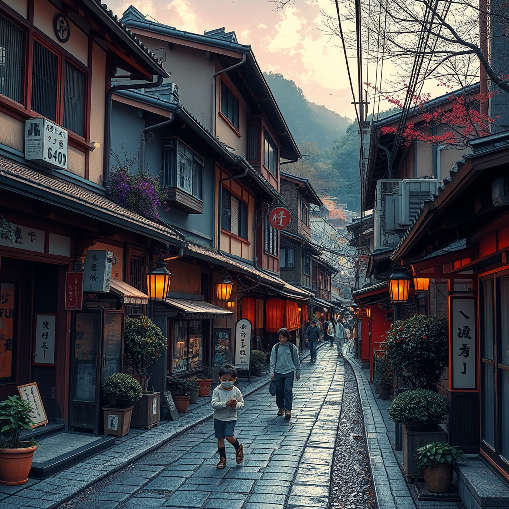 kyoto village walk in japan capturing the essence of hinchel and villagecore with a manga-influenced style; spiritual resonance permeates the vibrant yet tranquil scenery; inspired by john salminen, the scene is intricately multi-layered and immersive, showcasing high quality artistry; a fusion of tradition and modernity reflected through rich textures and harmonious colors within urban and natural elements; --ar 17:32 --stylize 750 --v 6