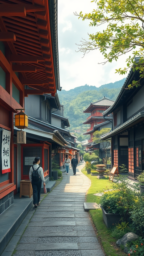 Kyoto walking tour Japan, imbued with a villagecore aesthetic, influenced by manga's vibrant storytelling and spirituality. Capture the essence of a Hinchel-inspired scene with layers of intricate detail akin to John Salminen's artistry. Picture a serene landscape with ancient temples and winding paths, resonating with spiritual energy. High-quality visuals convey the timeless beauty of traditional village life, with stylized elements that blend authenticity and imaginative flair in an elongated frame format.