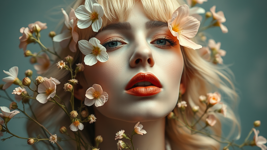 Lady Gaga album cover featuring a portrait adorned with delicate flowers, inspired by the artistic style of Helene Knoop and featuring light bronze and gold hues. The image captures the ethereal romanticism with a pop influence reminiscent of Peter Coulson's photography. Taken with a Provia-like film effect, the scene incorporates surreal elements inspired by Emmy Bridgwater, creating a dreamlike, vibrant atmosphere with a 4:5 aspect ratio.