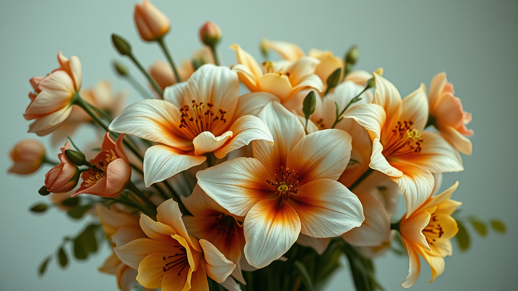 Lady Gaga album cover photograph featuring a bouquet of exotic flowers, in the style of Helene Knoop with a blend of light bronze and shimmering gold accents. Captured in Peter Coulson's ethereal and romantic aesthetic, infused with pop inspiration. The image features a dreamy, surreal quality reminiscent of Emmy Bridgwater's work, taken with the vibrant tones of Provia film, creating a harmonious fusion of modern fantasy and classic elegance in an elongated 4:5 ratio.