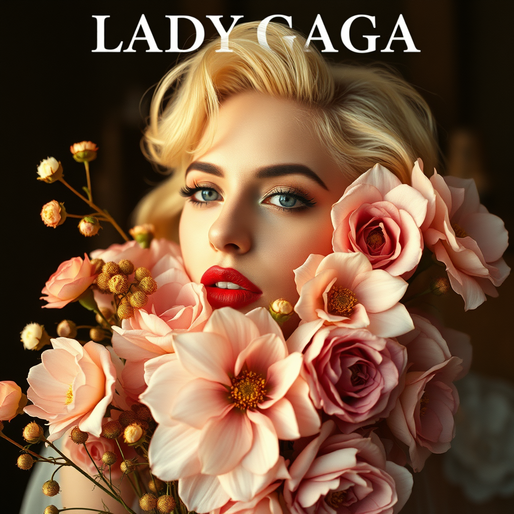 Lady Gaga album cover photograph featuring a stunning arrangement of flowers, inspired by the style of Helene Knoop with hues of light bronze and gold, capturing the ethereal romanticism essence. Infused with pop inspiration and photographed with Provia film aesthetics, reflecting elements of Emmy Bridgwater's surrealist touch, echoing the dramatic photography style of Peter Coulson, and set within an enchanting 4:5 aspect ratio.