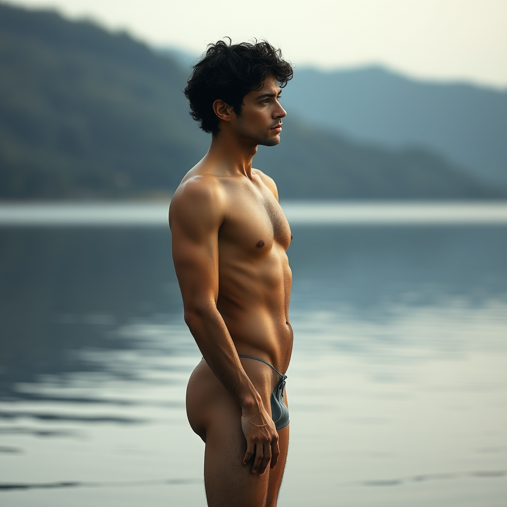 Lake serenity, slender model with short black curly hair, natural underarm hair, and round face, showcasing a textured chest and belly, with feet visible. Captured with a Nikon, highlighting flawless male physique in sharp focus, standing in a poised stance, muscular and fit. A composition of striking elegance by an inspiration akin to John Collier, using muted colors and intricate detail, portraying an exceptionally handsome man with dynamic and captivating posture.