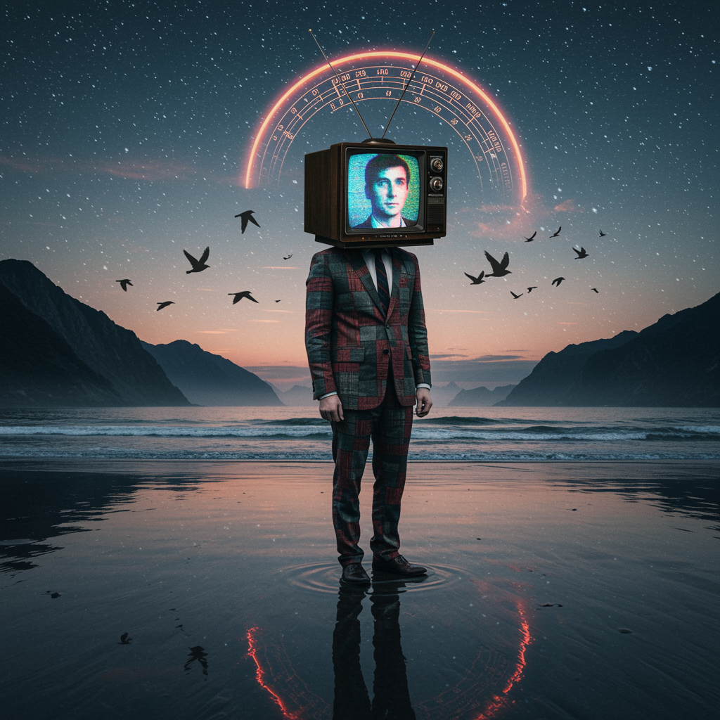 A surreal landscape features a man with a vintage television as his head, displaying his own face in an infinite loop. His body, dressed in a patchwork suit of mismatched patterns, stands on a beach where the sand fades into a cosmic night sky. Birds made of flickering static fly around, and the glowing moon transforms into an oversized dial from an antique radio. His reflection on the water shows a library of unwritten books lined up along his shoulders. In the background, towering mountains shaped like old radio antennas emit soft, ethereal music notes that float through the air like drifting clouds.