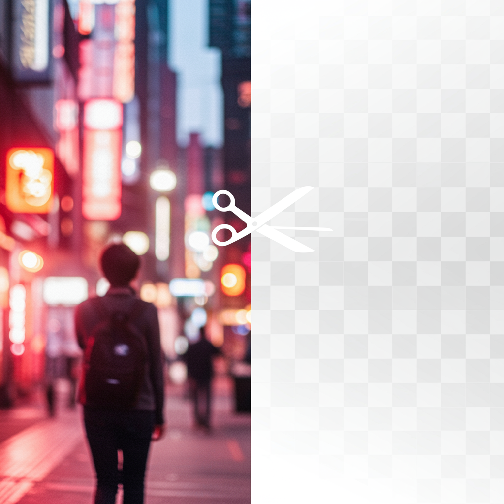 A sleek and modern landscape-format banner image showcasing a background removal concept. The left side features a vibrant, high-resolution photo of a person in a lively urban environment, filled with dynamic elements and energy. The image transitions smoothly to the right side, which displays a transparent checkerboard pattern, symbolizing the removed background. A stylized, elegant scissor icon or a subtle cut line divides the two halves, maintaining visual balance. The overall design is minimalist and tech-inspired, with soft, diffused lighting and gentle pastel colors. The composition highlights clarity and contrast, offering a polished and professional look, perfect for a website or product interface.