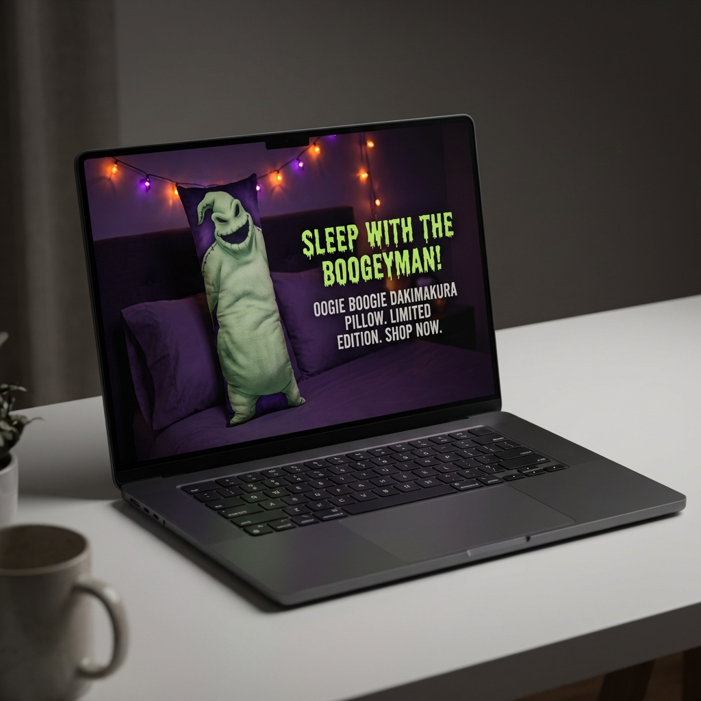 Laptop Displaying Oogie Boogie Dakimakura Advertisement