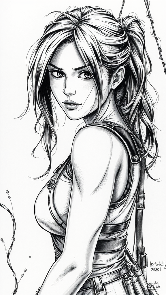 Lara Croft full body, manga style, comic book essence, black and white pencil sketch, highly detailed and intricate, trending on ArtStation, extreme graphical details, cinematic composition, photography-like atmosphere, stunning and immersive environment, refined line art, evocative and award-winning theme, smooth and surreal rendering, celestial and elegant appearance, oil paint texture, soft and fascinating, fine art quality, official art CGI inspired, 3D model, doll-like finishing, octane render style, with intentional artistic distortions such as blurred features, abstract anatomy, and elements of disfigurement, including additional limbs and fingers, resulting in a unique, deformed yet captivating masterpiece.