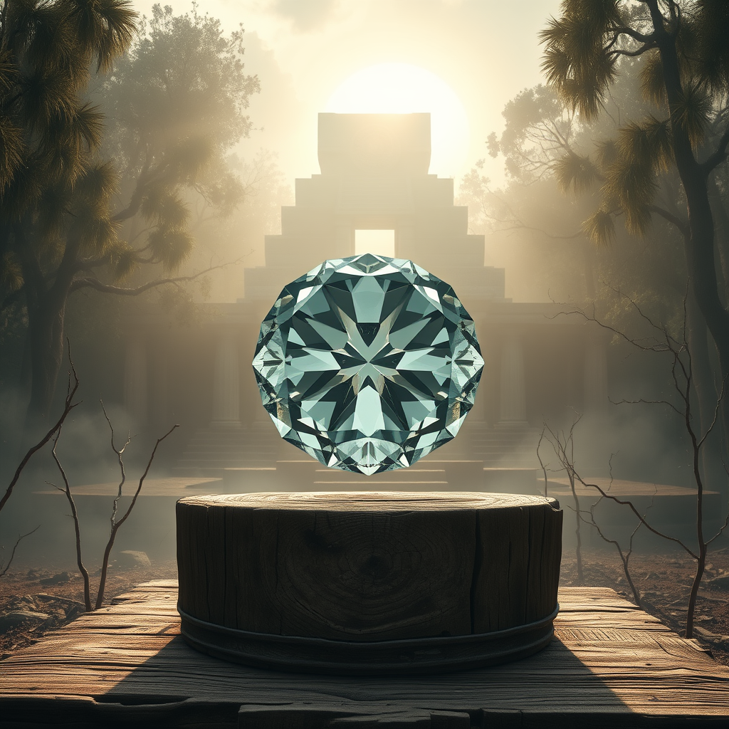 large cut transparent diamond nestles on an ancient weathered wooden pedestal amidst the misty veil of a forest, amidst dead willow trees, and the majestic aztec stairway entranceway leads to the rays of the rising sun amidst the perpetual smoke of a raging wildfire and the muted tones of the fading ruins of a mystical pre-columbian temple