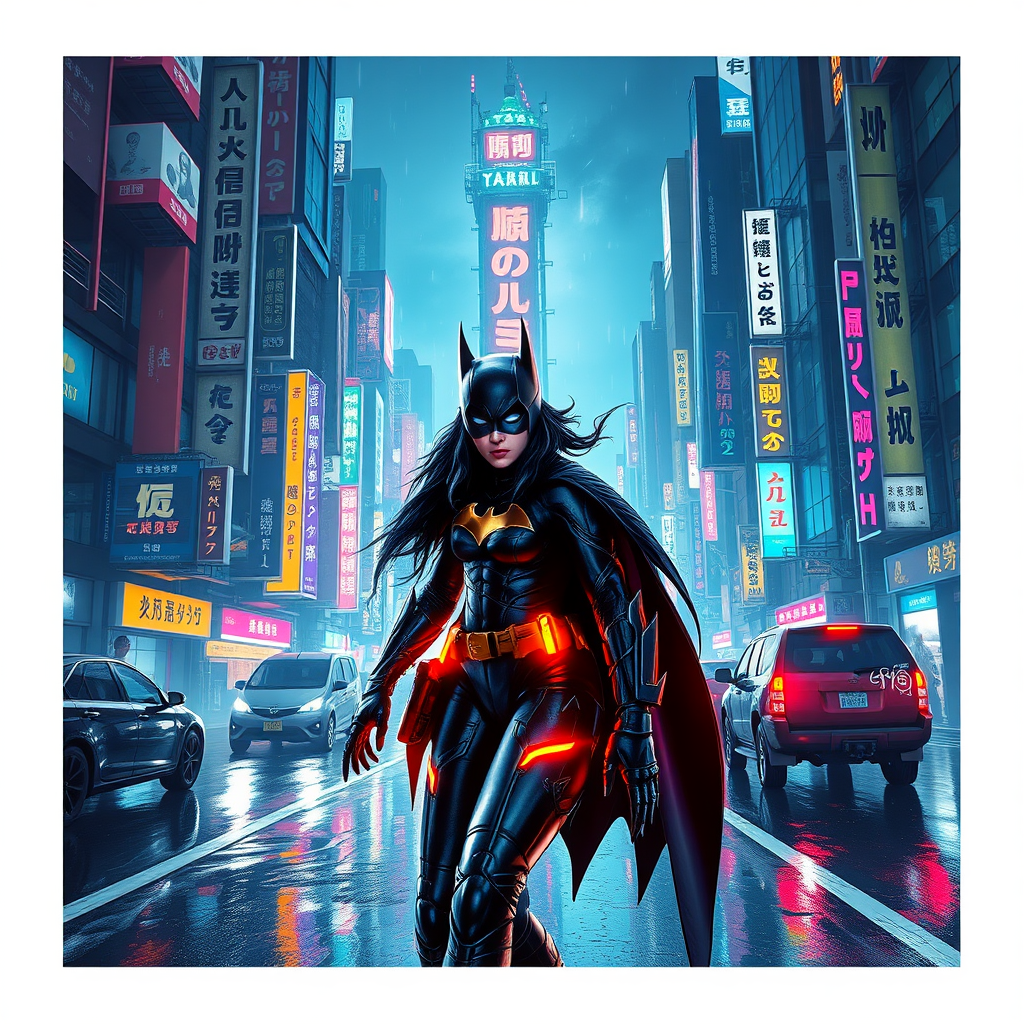 Large white border surrounds a vibrant poster featuring Batgirl in a futuristic Tokyo cityscape, infused with cyberpunk aesthetics. The scene, inspired by Maciej Kuciara and cgsociety, showcases a blend of deconstructivism, synthwave colors, and darksynth vibes, with a dystopian undertone. Japanese characters overlay the image, adding cultural texture, while neon lights reflect off wet surfaces, creating a dynamic, immersive atmosphere reminiscent of Behance HD visuals. Shadows and highlights create a sense of depth, evoking a gritty yet visually captivating urban landscape.