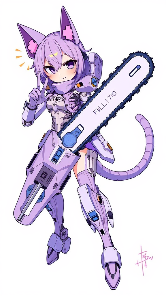Lavender-themed, high-quality illustration featuring a mecha musume character with cat ears and mechanical parts, wielding a chainsaw. The character is adorned with an exoskeleton, showcasing intricate mechanical details. Presented on a white background, the artwork includes a subtle watermark and signature with the artist's username and name in the corner, capturing the essence of the badhandv4 style.