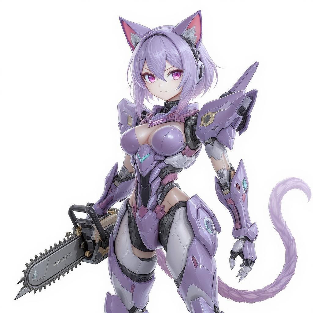 Lavender-themed, high-quality mecha musume with cat ears, adorned with mechanical parts, sporting an exoskeleton design, wielding a sleek chainsaw, blending futuristic elegance with a touch of feline grace.